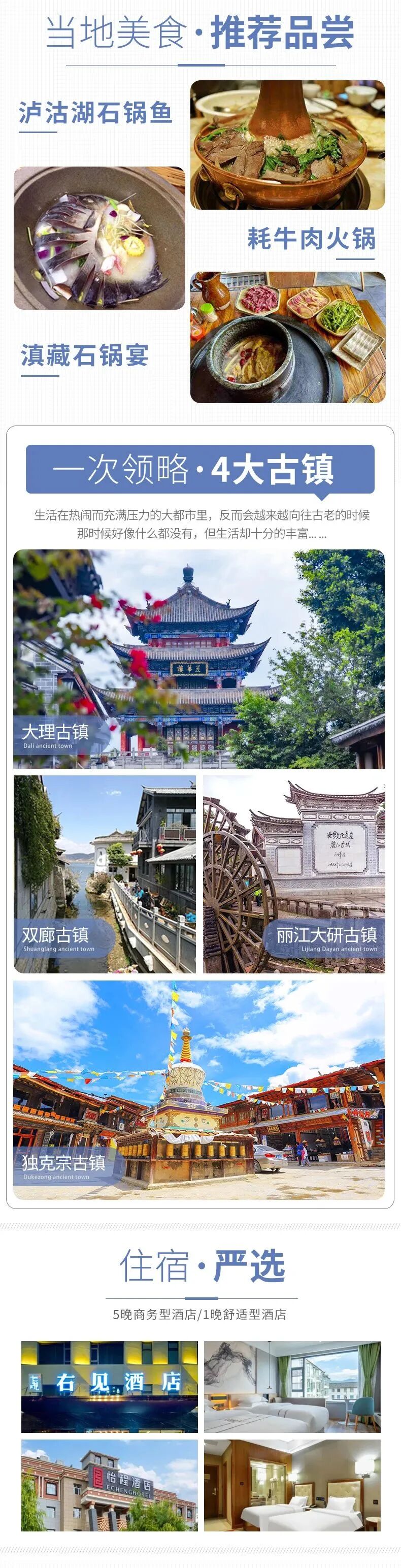 1.住宿:丽江商务型酒店标间2晚、泸沽湖舒适型酒店标间1晚、大理商务型酒店标间1晚、香格里拉商务型酒店标间2晚(舒适型按当地三星酒店建造,商务型按当地四星酒店建造,旅游景区经济较为落后,酒店和南方城市酒店无法相比,敬请谅解)