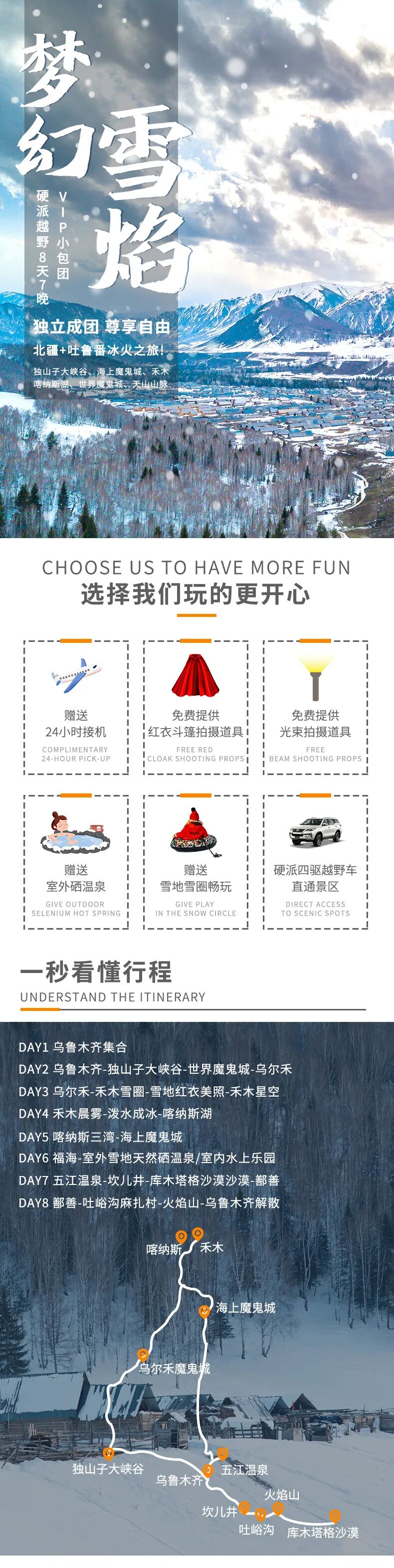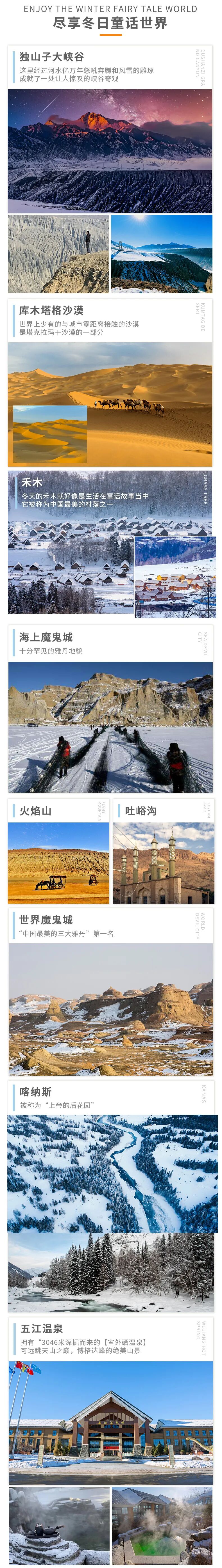 4、门票:乌尔禾魔鬼城门票+环保车,海上魔鬼城环保车,喀纳斯禾木冬季通票,吐峪沟门票,库木塔格沙漠沙漠+环保车,坎儿井门票。