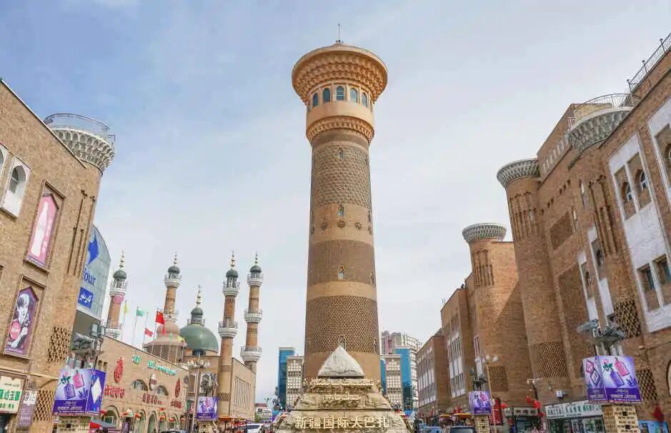 【国际大巴扎】——世界上规模最大的巴扎(巴扎为维吾尔语,意为集市)。具有浓郁的伊斯兰建筑风格,体现了浓郁的西域民族特色和地域文化,这里除了有令人眼花缭乱的商贸市场外,还有美食广场、观光清真寺、80米高的新疆第一观光塔等设施。