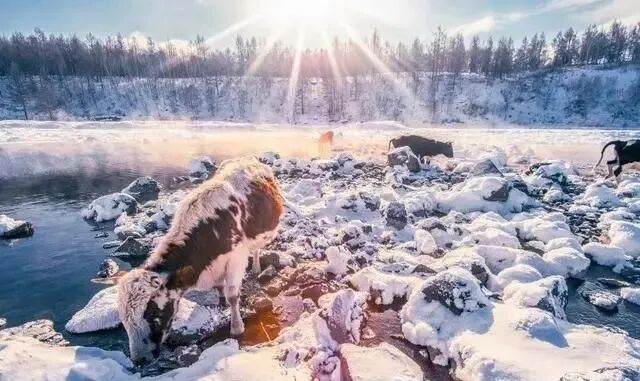 不冻河是哈拉哈河的一段河流,哪怕在零下30℃的寒冬,这里的河水也不会结冰,非常奇妙。附近的牧民们也会在这里放牛放羊,成群的牛羊在水边喝水觅食。