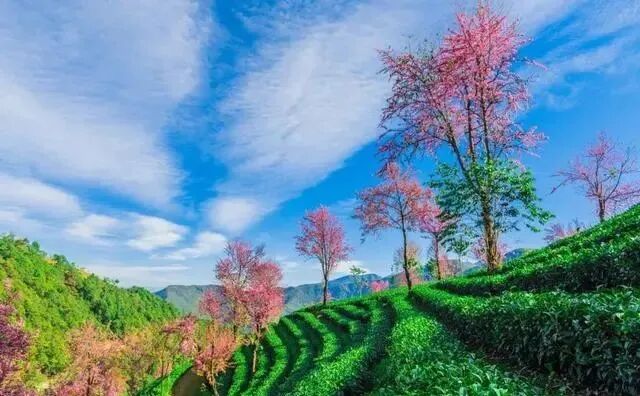 踏着冬的脚步,步入这个春的世界里,一团团的粉,一团团的红,嫩嫩的,柔柔的散落在一片碧绿的叶浪里,微风过处,片片樱花瓣飘落,好似在蓝天下沐一场樱花雨,此种美妙——等你!