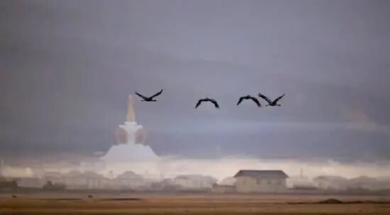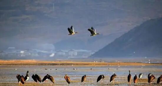 冬天,皑皑白雪,洒满大地,黑颈鹤、金雕、斑头雁等珍稀鸟类在雪花覆盖的草丛中、水面上嬉戏漫游,为高原草甸带来生机。皑皑雪峰倒映于湖泊之中,如同山水画般让人着迷。