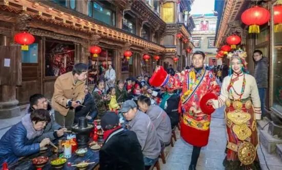 冬天,古城游客稀少,显得十分清净。绵绵白雪装饰着藏式民居,粉装玉砌,皓然一色,穿着传统服装的老人缓缓走过古城,随心慢逛的游客不时走进街边小店喝起酥油茶,或加入当地居民的舞蹈中去,享受“乌托邦”式的欢快、悠然。