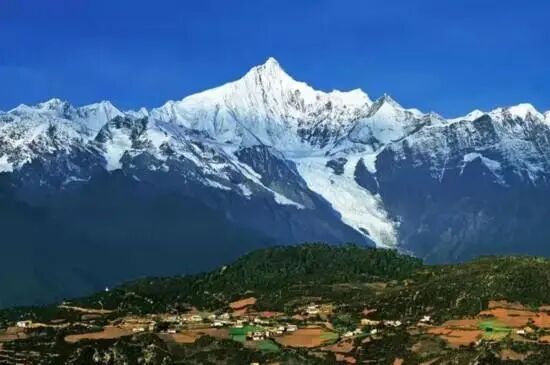 冬天,明永冰川的冰舌从海拔5500米往下延伸到海拔2800米处,如一条银鳞玉甲的游龙,从高高的雪峰一直延伸到山下,直扑澜沧江边,绝美而神奇。