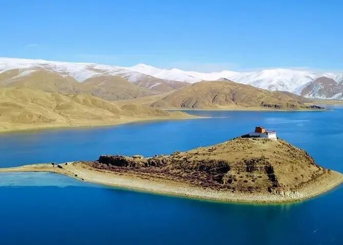 这座水滴状的小岛,遗世独立于碧玉羊卓雍措之畔,四面环湖 风景壮美,让人好似置身世外,瞬感心旷神怡 海阔天空。