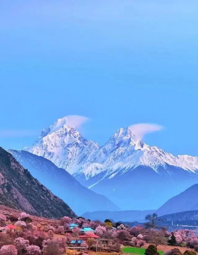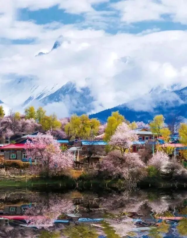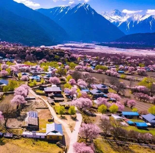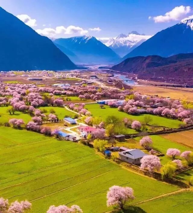 每年的春天,印度洋的暖流吹过林芝,为林芝带来了生机,此时万亩桃林,竞相开放,与油绿的青稞地相辉交映,远处的雪山,蓝天白云,云雾缭绕,俨然是世外桃源。