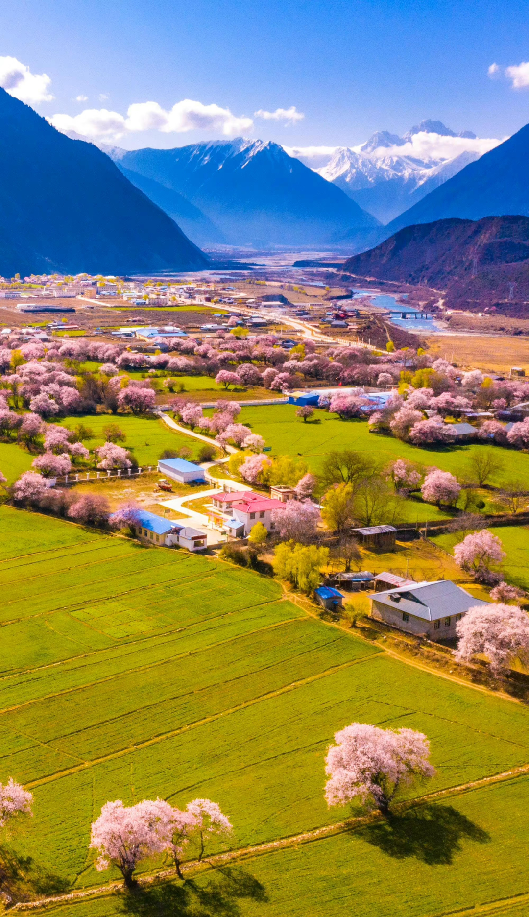 洁白的雪山、粉色花海、翠绿的麦田、金黄的油菜、碧蓝的湖水、林芝用斑斓的色彩告诉人们,什么是真正的藏地江南。