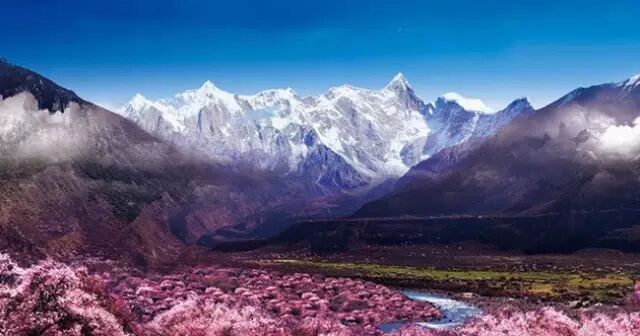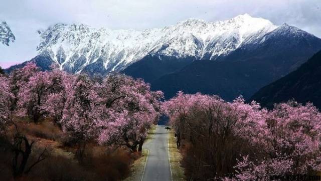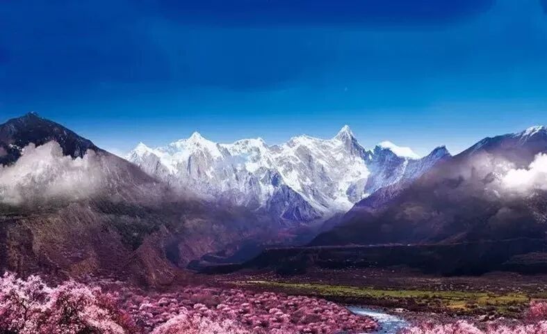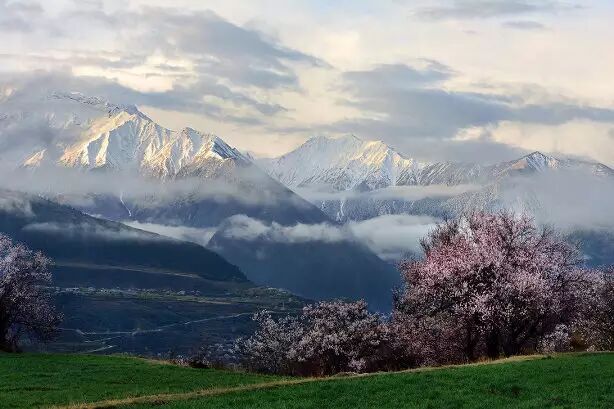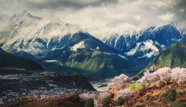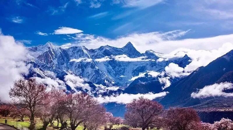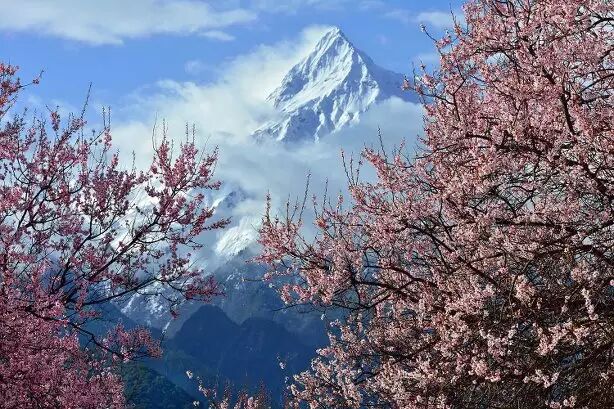 林芝虽是西藏海拔最低的地方,却仍不缺雪山冰川,每当春寒料峭之时,河谷里绽放的是蔚然如烟的桃花,抬头看却仍然是终年不化的冰雪。