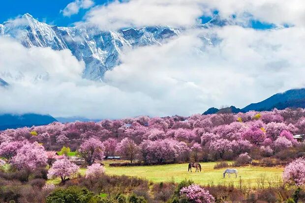 同样以“江南”著称的雪域高原上,每年的三四月份,绵延百里的桃色花海,粉饰着整个林芝。与淳朴的金川梨花不同的是,它开的更加热烈。