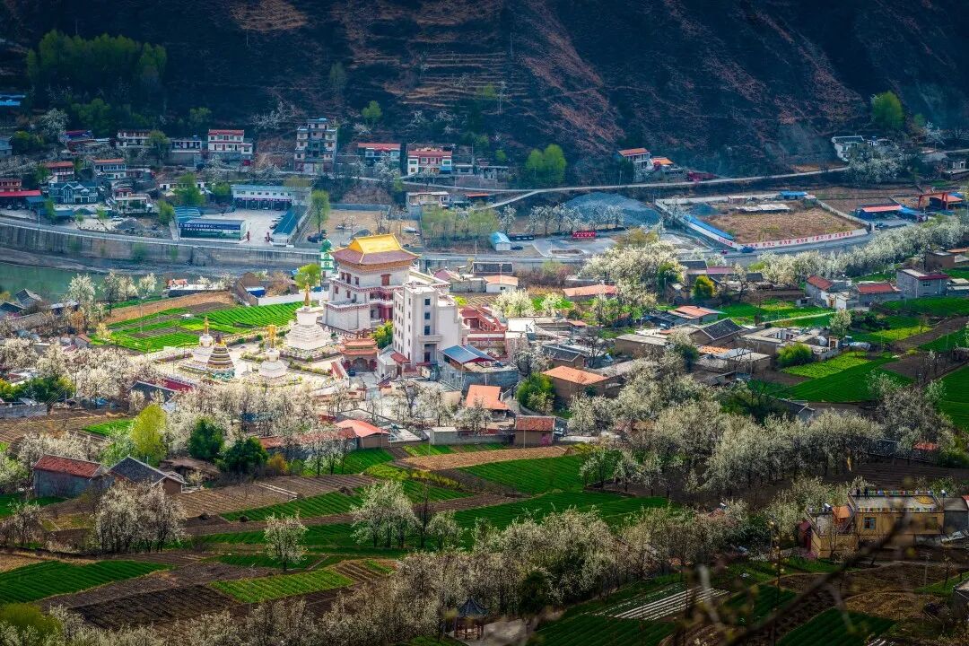 它与周围的蓝天、白云、麦地、梯田、河流、藏式民居、碉楼形成了一幅美丽的“世外梨源”风光。