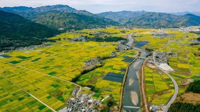 连绵起伏的山峦下,一片片、一簇簇盛开的金黄油菜花,仿佛是最美的颜料,将这天地间渲染得灿烂夺目,入眼只觉得震撼。