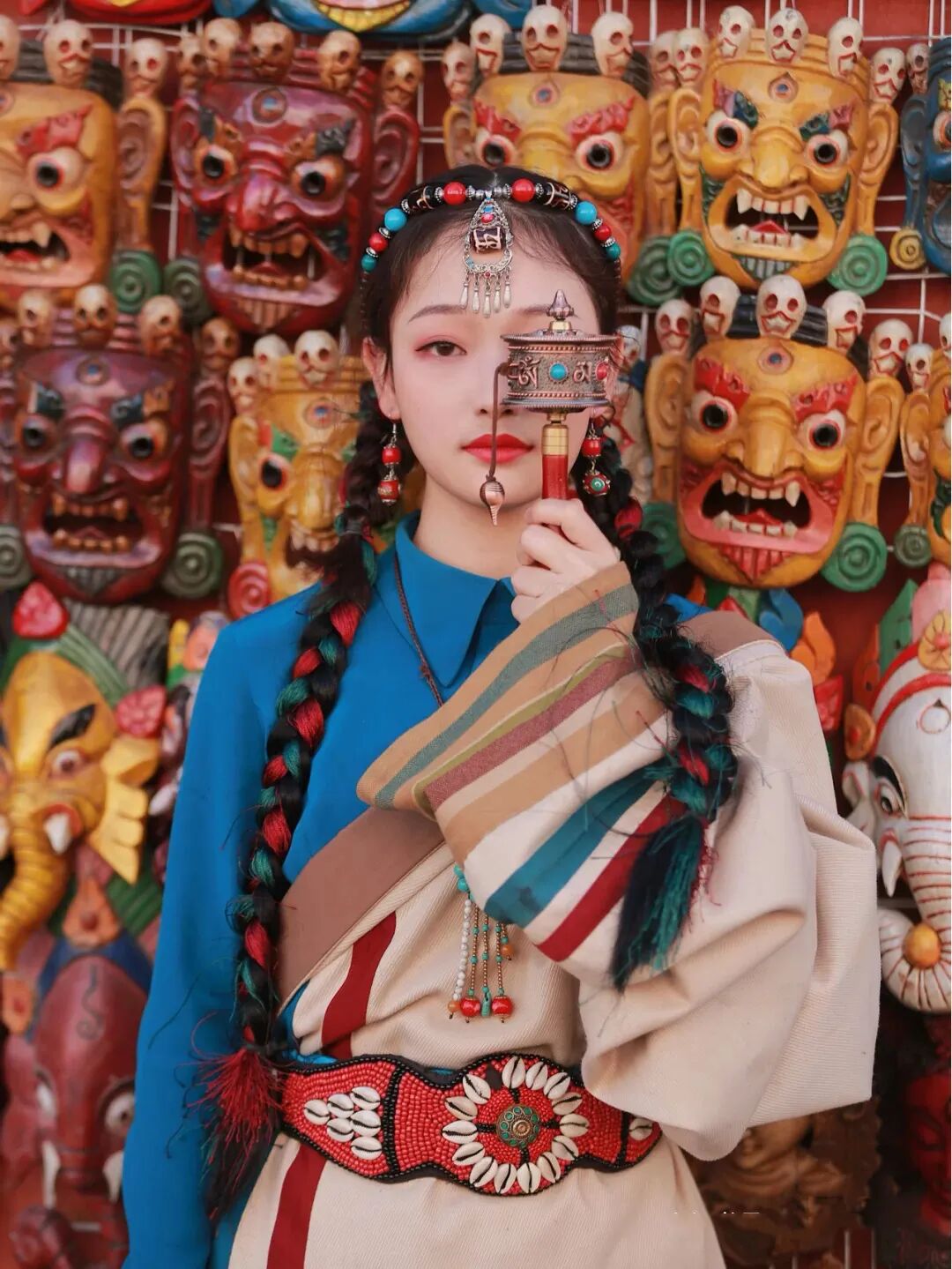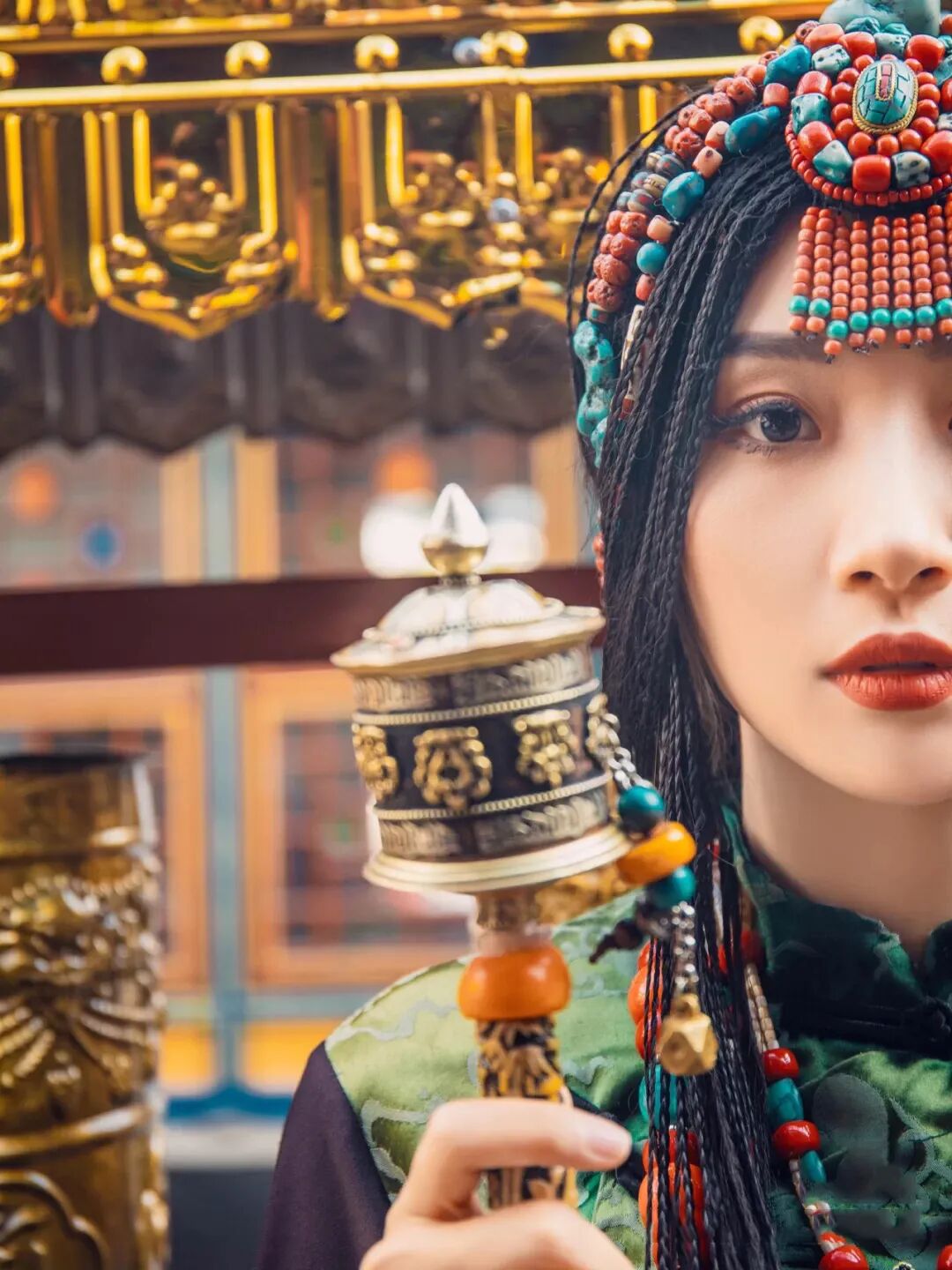 又比如,用转经筒遮住半边脸,拉近景特写,