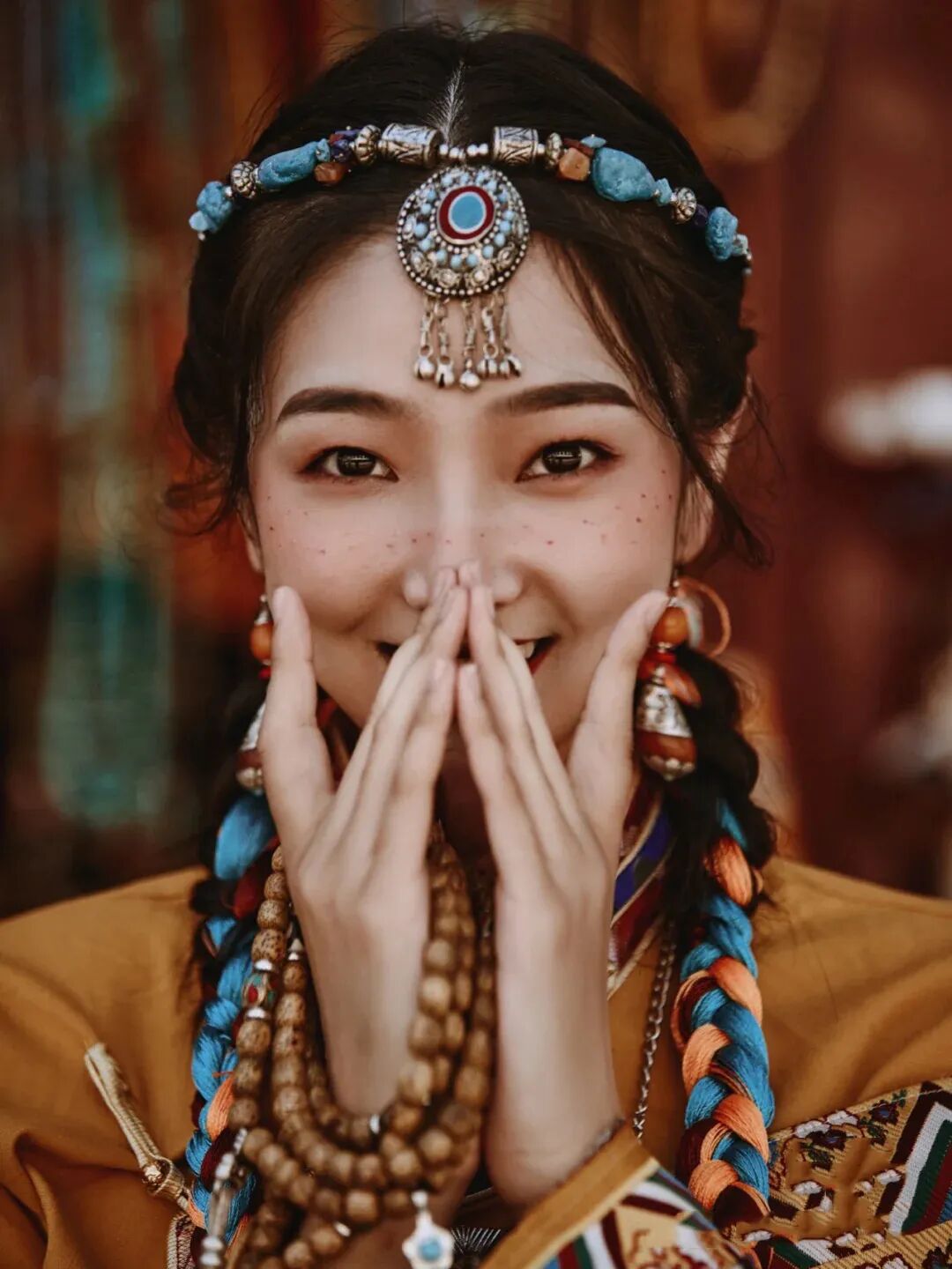 这里不仅适合色彩浓重艳丽的藏服,也更适合暖色的妆容,如果点上几点雀斑,打个腮红,画个高原妆,拍出照片往往更有大片感!