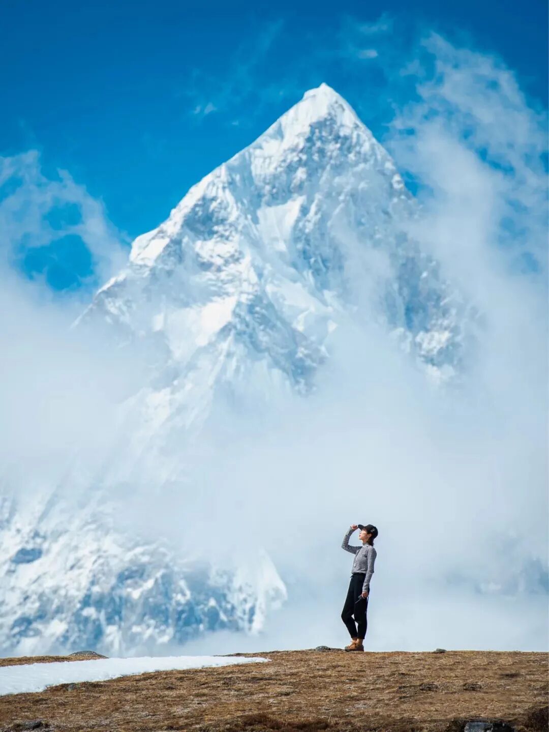 高大的雪山怎么拍?以白雪皑皑的高雪山为背景,拍人近景特写超好看!而且是最简单好操作的!