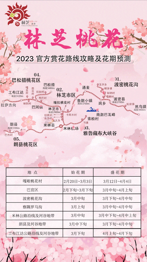 林芝市第二十届桃花旅游文化节将于2023年3月28日开幕,林芝全境桃花也将迎来盛放,西藏天气变化莫测,请您留意出行天气和相关路况,注意行车安全,做好保暖措施。