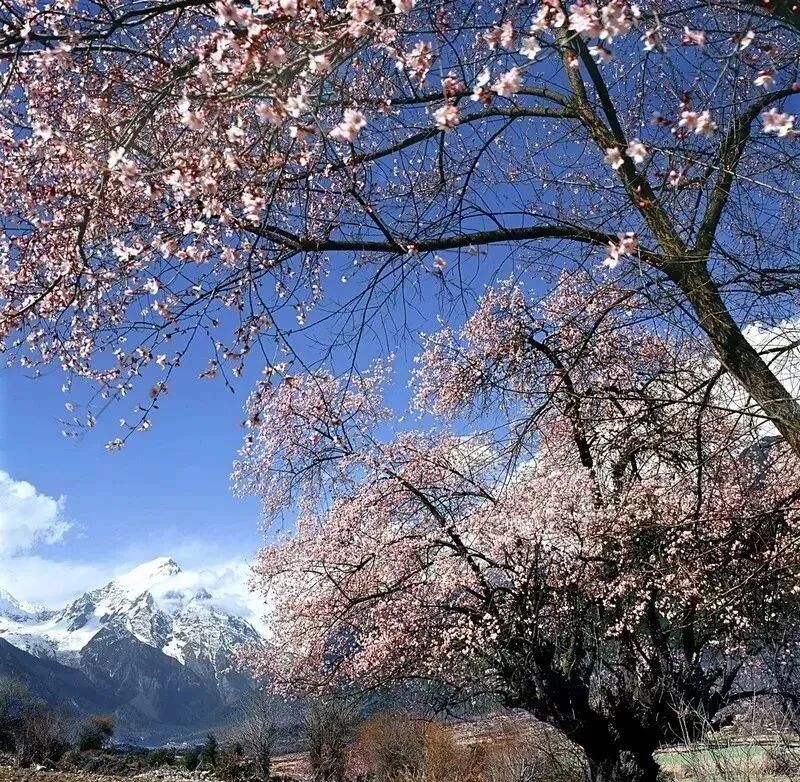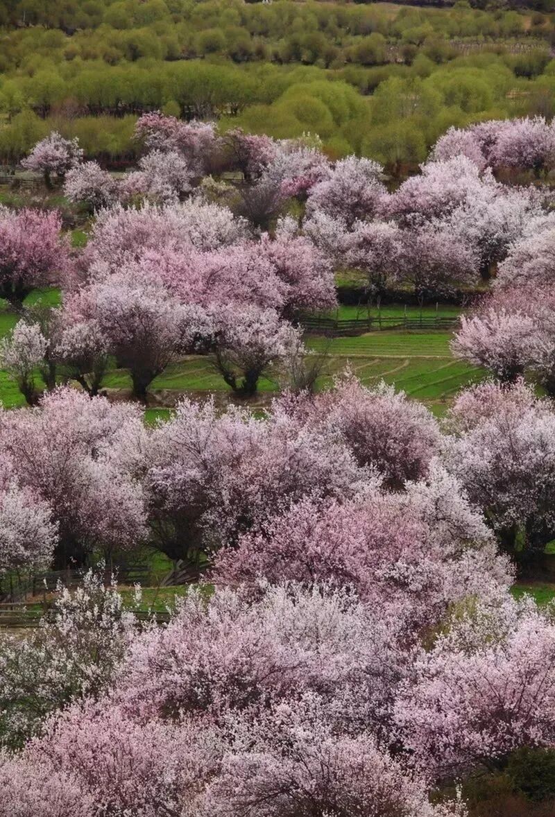 20万株平均树龄360岁的野生桃树随意站在波堆藏布两岸的山谷田园中,与雪山、江流、湖泊相映。
