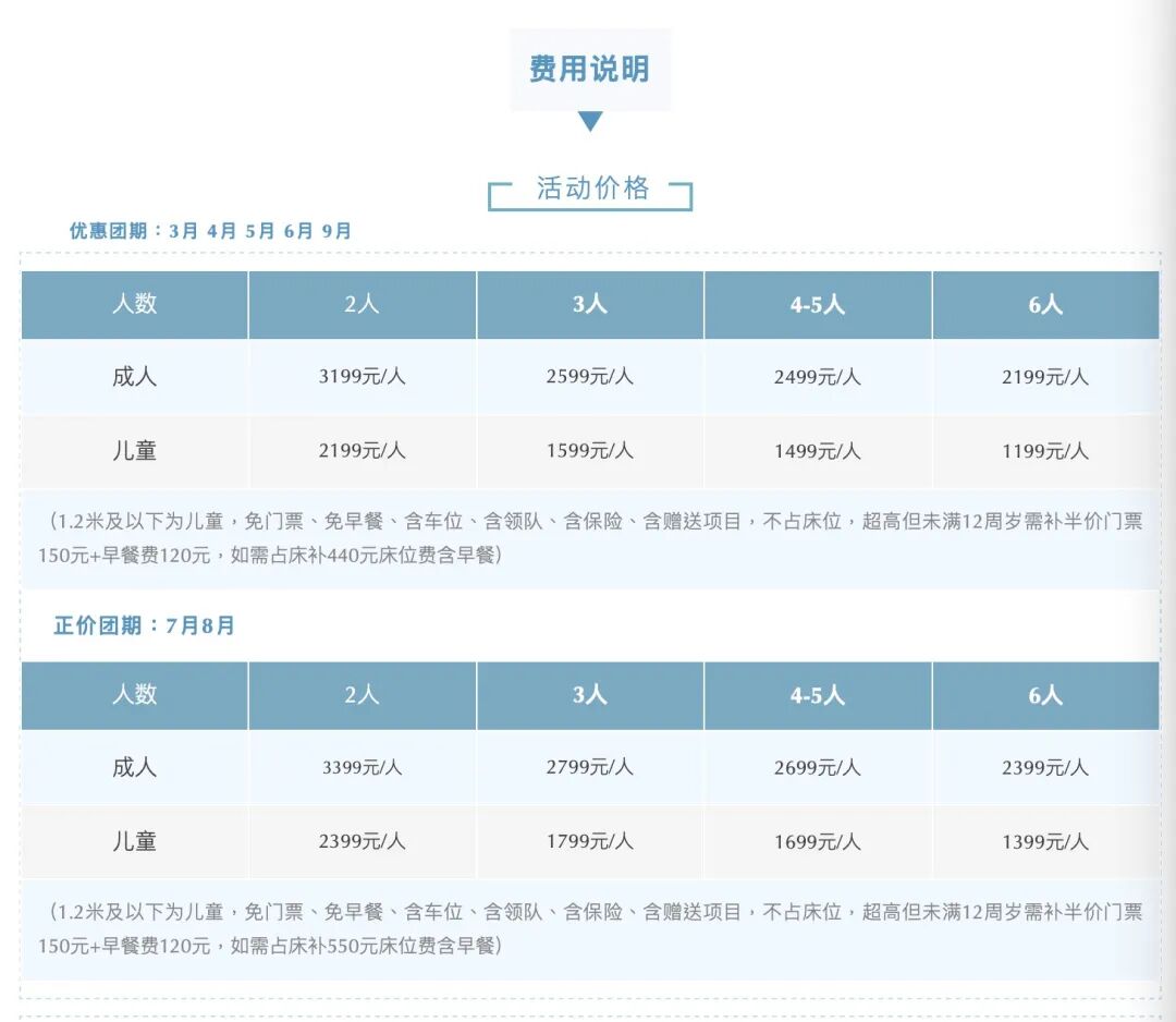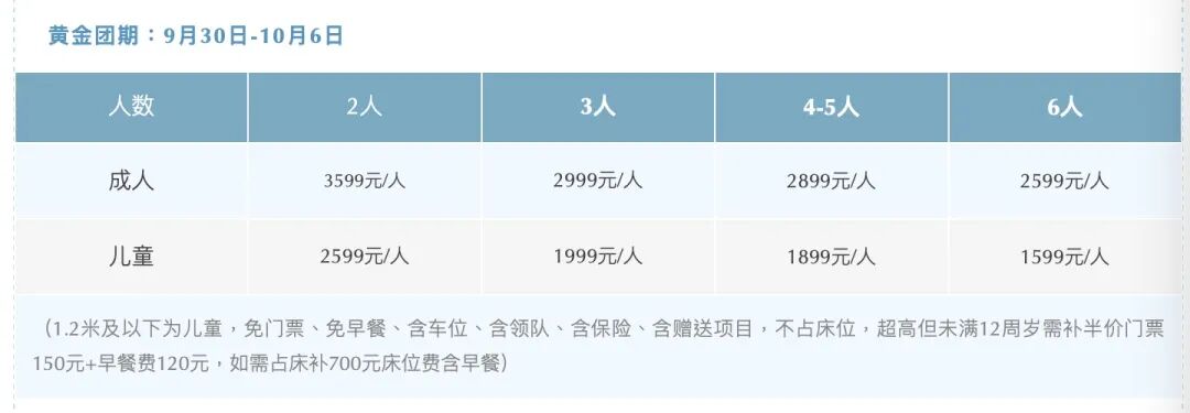 1.2米及以下为儿童,免门票、免早餐、含车位、含领队、含保险、含赠送项目,不占床位,超高但未满12周岁需补半价门票150元+早餐费120元,如需占床补440-700元床位费含早餐