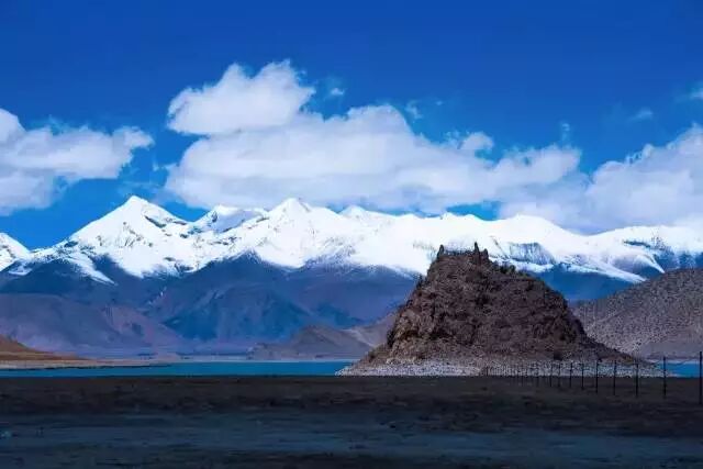 羊湖西面屹立着海拔7206米的神山乃钦康桑