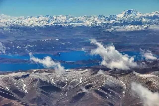 (拉萨至加德满都航班上拍摄的羊湖和库拉岗日群峰 图片来源于网络)