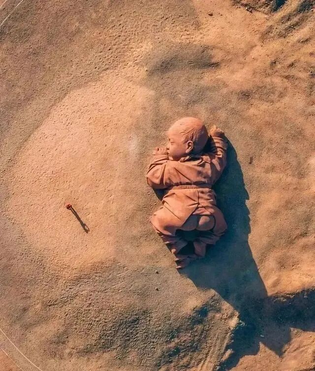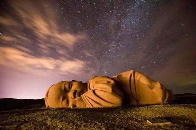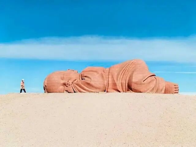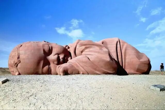 在瓜州县以南十公里的戈壁沙漠深处,有一个头部紧贴着沙漠,屁股朝天,伏案沉睡的沙漠巨婴,这就是远近驰名的《大地之子》雕塑。以天为被,以地为床,"婴儿"静静的躺在母亲的怀里,像是在仔细地倾听母亲的声音。他深情安详地伏俯在大地上,人与自然生命共生,和谐共存。