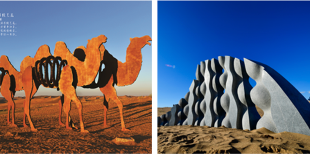 一雕一景,一塑一色。这里一座座“艺术珍品”如同夜空中的星星,点缀于连片沙海之上,与蓝天夕阳、金色大漠完美融合。这里以全新的生态理念、文化符号和艺术风格,凸显着艺术与生态结合的震撼,传播着人沙和谐共生理念,书写着诗意壮美的沙漠雕塑艺术诗篇。