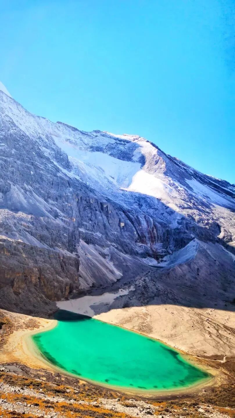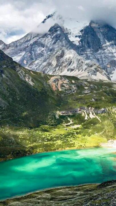 四周雪山环绕,湖水清莹碧蓝,山止成瀑