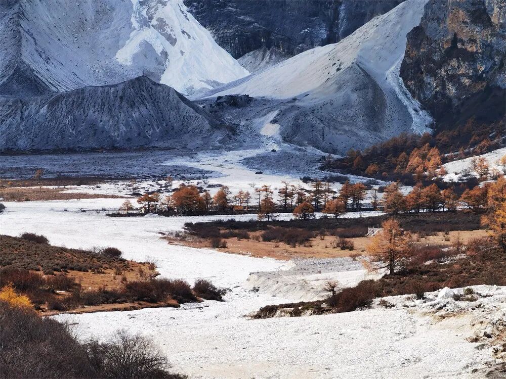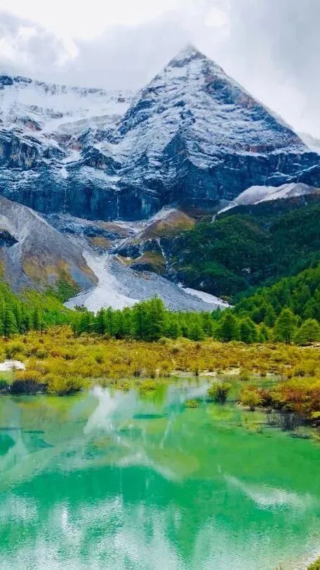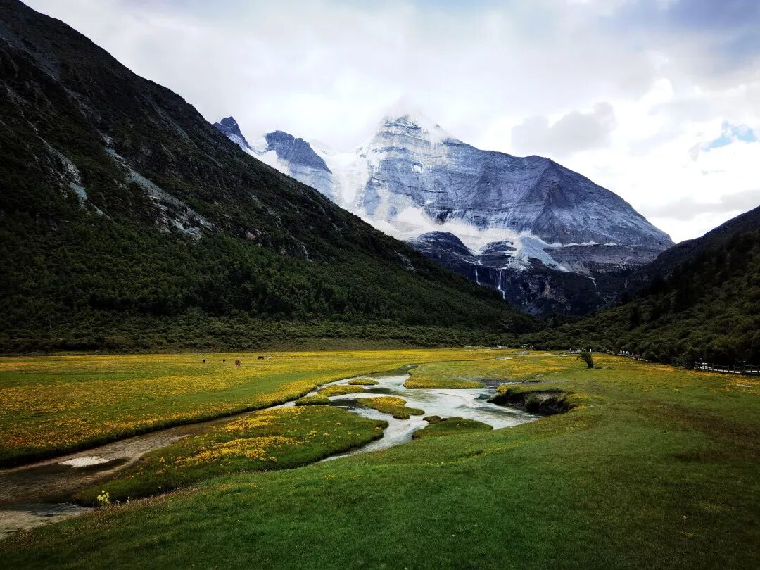 在央迈勇雪山的烘托渲染下,显得清远空灵