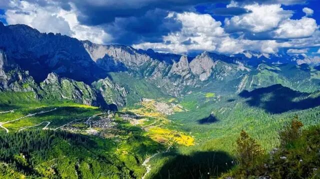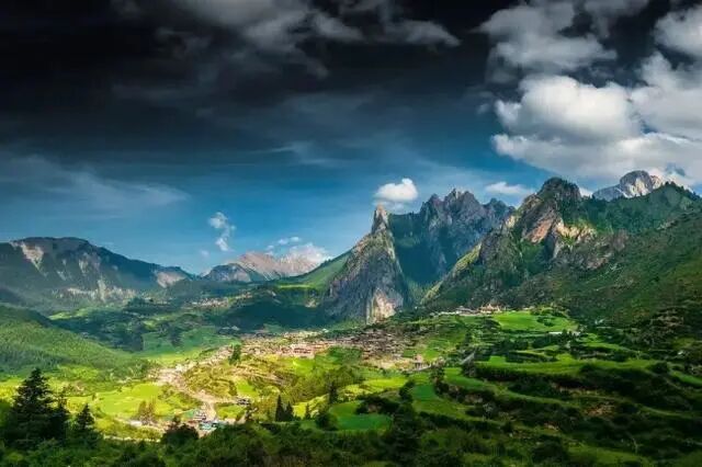 从高空中俯瞰扎尕那,任谁都会惊叹造物主那等同鬼斧的手艺,藏式风情、冰雪秘境、高山草甸、成群牦牛、漫山绿叶、古老藏寨……