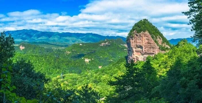 麦积山位于天水市麦积区,是小陇山中的一座孤峰,因山形酷似麦垛而得名。麦积山周围风景秀丽,山峦上密布着翠柏苍松,野花茂草。攀上山顶,极目远望,四面全是郁郁葱葱的青山,只见千山万壑,重峦叠嶂,青松似海,云雾阵阵,远景近物交织在一起,这就是被称为天水八景之首的"麦积烟雨"。