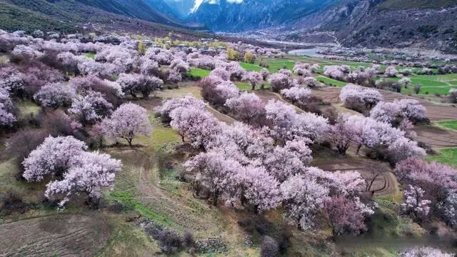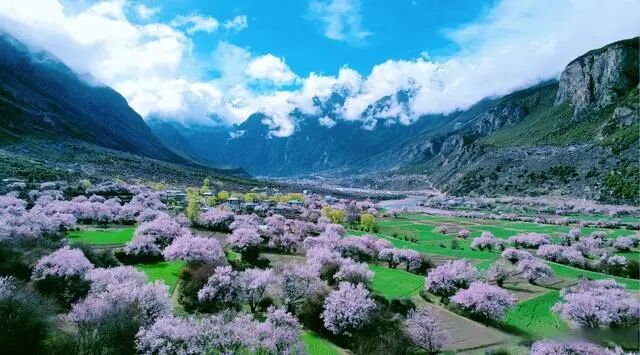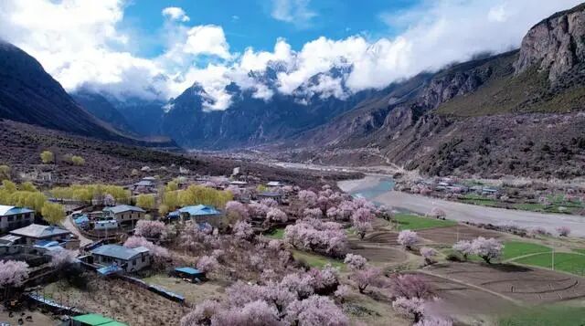 一片鲜为人知的桃林,桃花盛开在山谷田野间。藏式民居星罗棋布,飞鸟翔集,牛羊成群。原始古朴的村落,宁静唯美的田园风光这就是藏东秘境中的秘境: 嘉黎 县尼屋桃花,雪山环抱下隐匿的世外 桃源。