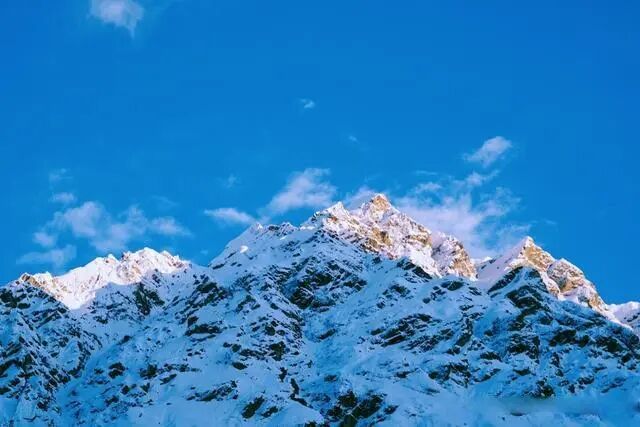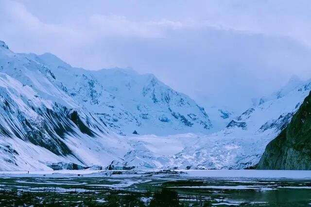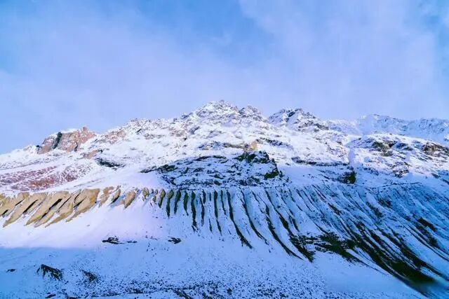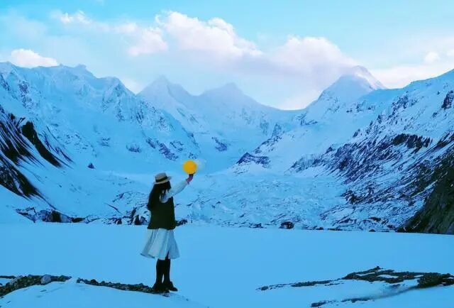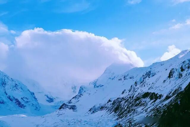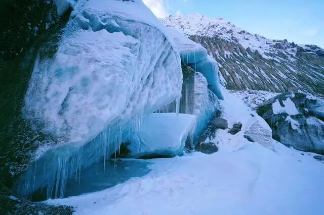 春日 里的祥格冰川四周仍旧被厚厚的白雪拥抱着,左侧的山头时而有小型雪崩,因而在不了解此地地质情况的前提下,不建议深入探秘祥格拉冰川。在云雾缭绕之下,日落黄昏时的祥格拉冰川显得格外美丽。在实地情况安全的条件下,可冰川里头徒步,能发现大大小小的冰洞、冰舌,极富探索乐趣。
