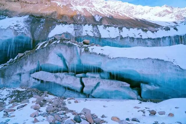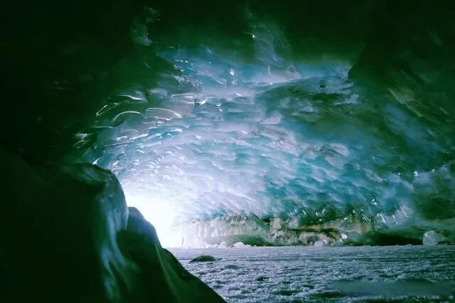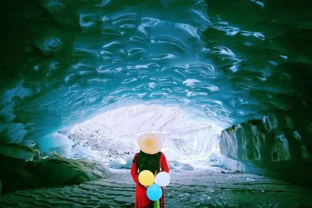 贡嘎 冰洞冰洞内部呈弧拱状,内壁皆为冰晶,犹如一个晶莹剔透的水晶宫殿。因洞的顶部呈现出“鱼鳞”状,整个冰洞内部都是淡蓝色的,漫步其中又像是走进了海底世界。