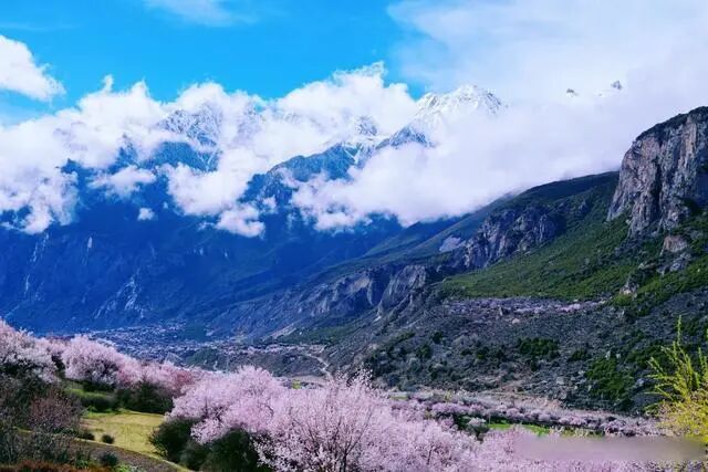 巍峨的高山之下,是一处宛如世外 桃源 般的藏族村庄。数十里的村子里,房前屋后都种满了桃花。一夜春风来,千树万树桃花纷飞,落在绿油油的原野,落在古朴的藏寨院墙上,落在碧蓝的河谷之中.......