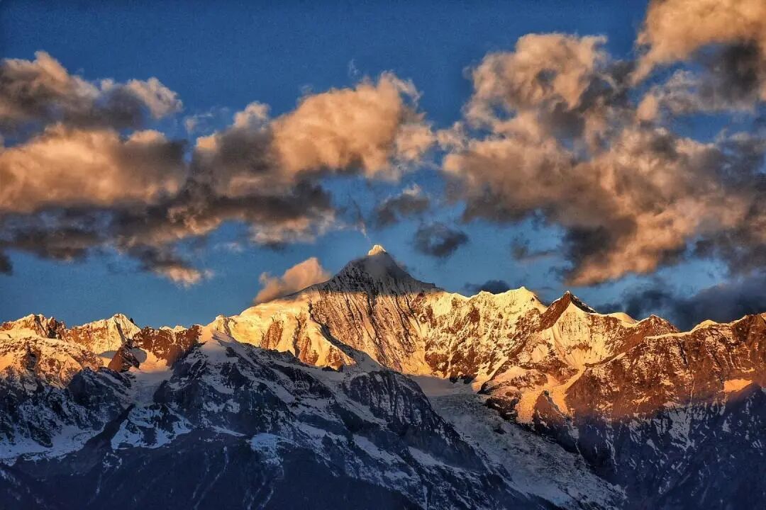 07:00 左右当云层破开,【梅里日照金山】璀璨的阳光泼洒向雪峰,耀眼的光从山顶一直蔓延到山下,万物从此发出强烈的生命力。那是梅里雪山与苍穹的对话:白塔流云、白塔、村庄……共同谱写出一曲自然的赞歌,唱响这幸运乐章。