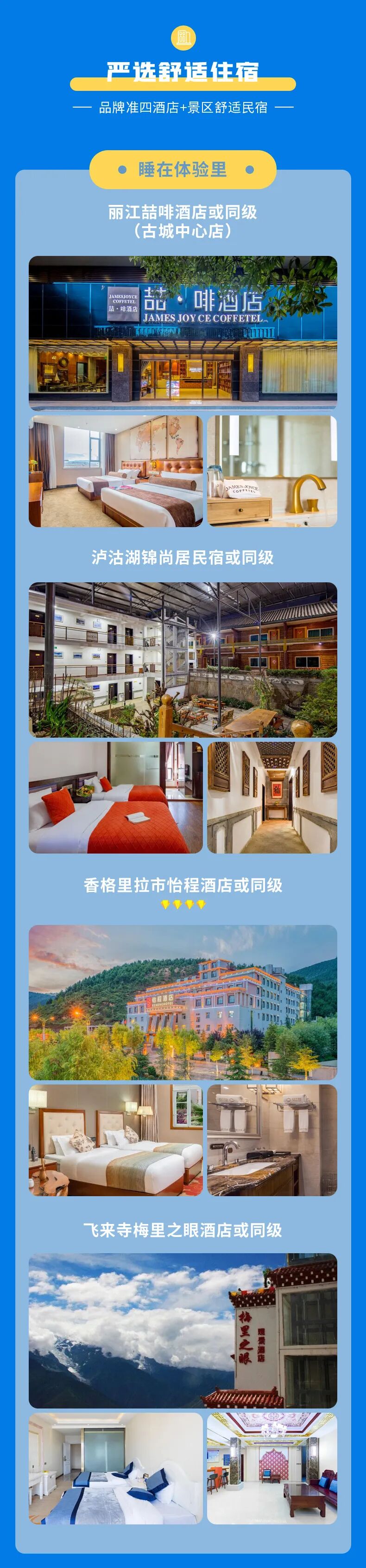 1.住宿:丽江商务型酒店标间2晚、泸沽湖舒适型酒店标间1晚、香格里拉商务型酒店标间2晚,飞来寺舒适型酒店1晚(舒适型按当地三星酒店建造,商务型按当地四星酒店建造,旅游景区经济较为落后,酒店和南方城市酒店无法相比,敬请谅解)
