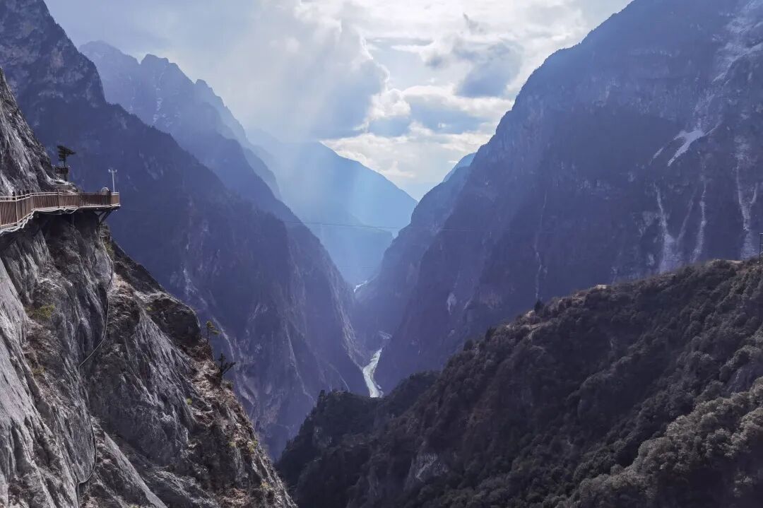 15:00 去往飞来寺的路上,有一处“三壁夹两江”的绝美奇观【金沙家大拐弯】。湍急的金沙江水顺着蜿蜒的“Ω”形状流淌而过。绘制出一副独特的自然景观。