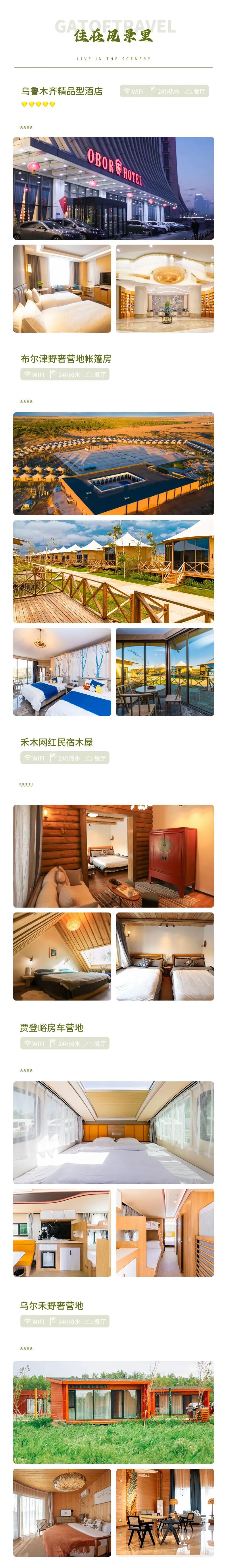 1、住宿:乌鲁木齐市精品酒店双标间1晚,布尔津县野奢营地1晚,禾木木屋1晚,贾登峪房车营地1晚,乌尔禾野奢营地1晚,唐布拉房车营地1晚,赛里木湖观湖营地1晚。