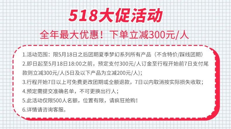 3、单房差:全程默认安排2人一间,如有单人需补单房差:优惠团期4500元,正价团期6000元。