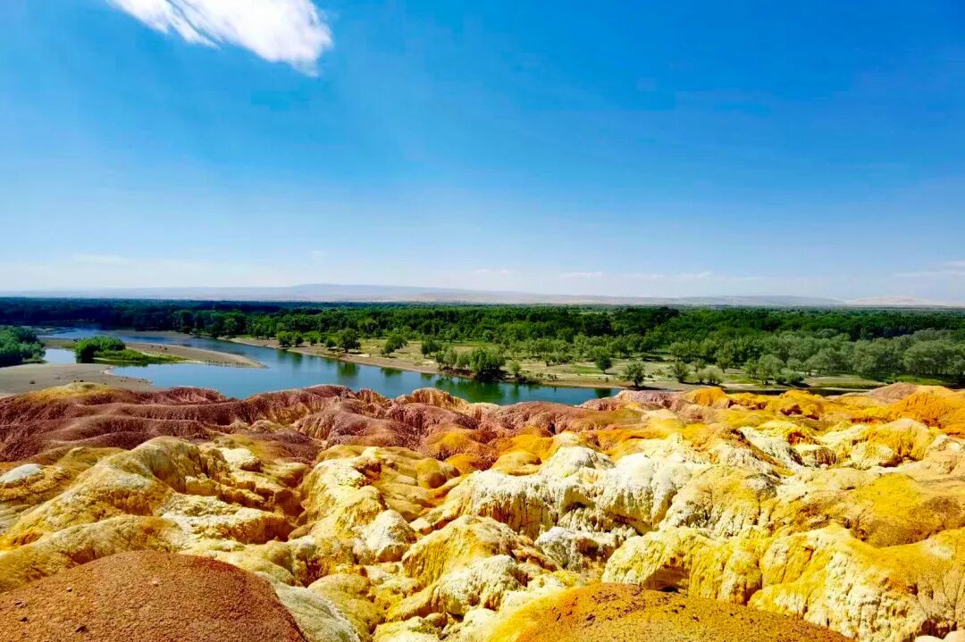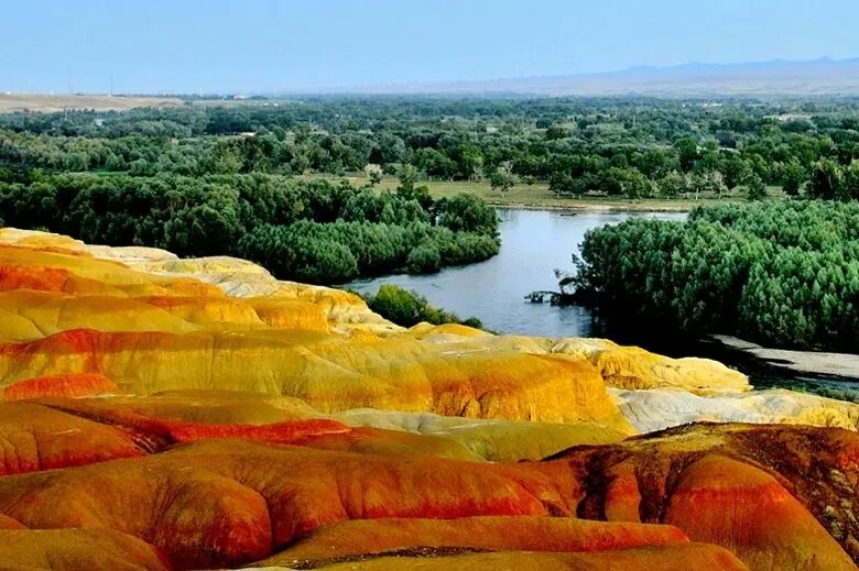 18:00抵达【五彩滩】,位置紧邻碧波荡漾的额尔齐斯河,与对岸葱郁青翠的河谷风光形成了鲜明的对比。五彩滩河岸是彩色斑斓、风景独特的熔岩地貌,由紫红、土红、浅黄和浅绿等泥浆、砂岩以砂砾组成,在河水的映衬和阳光的照射下五彩缤纷,十分壮观。