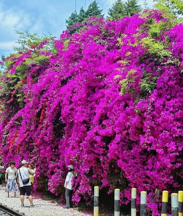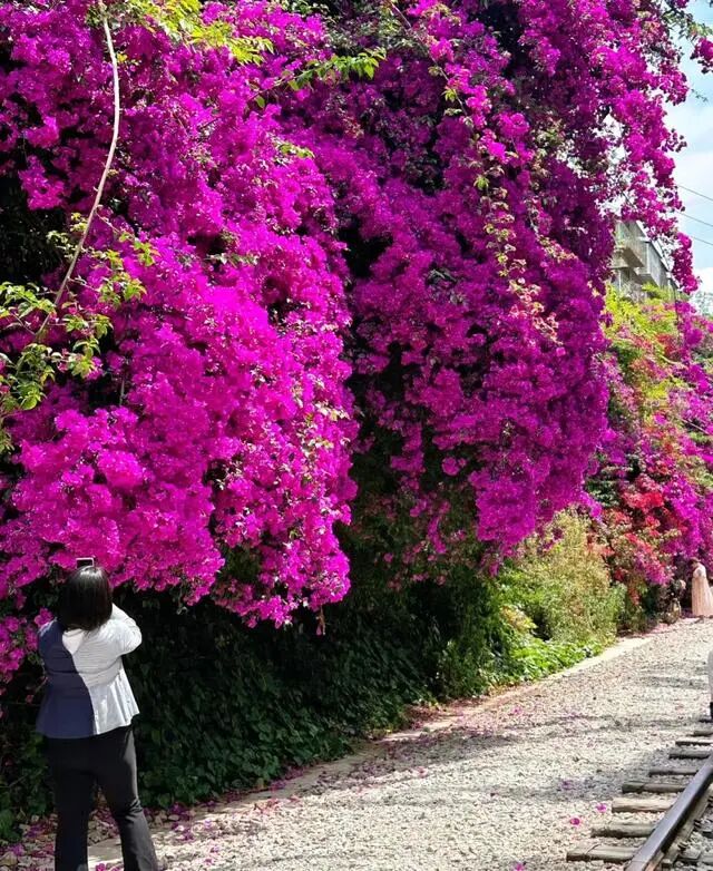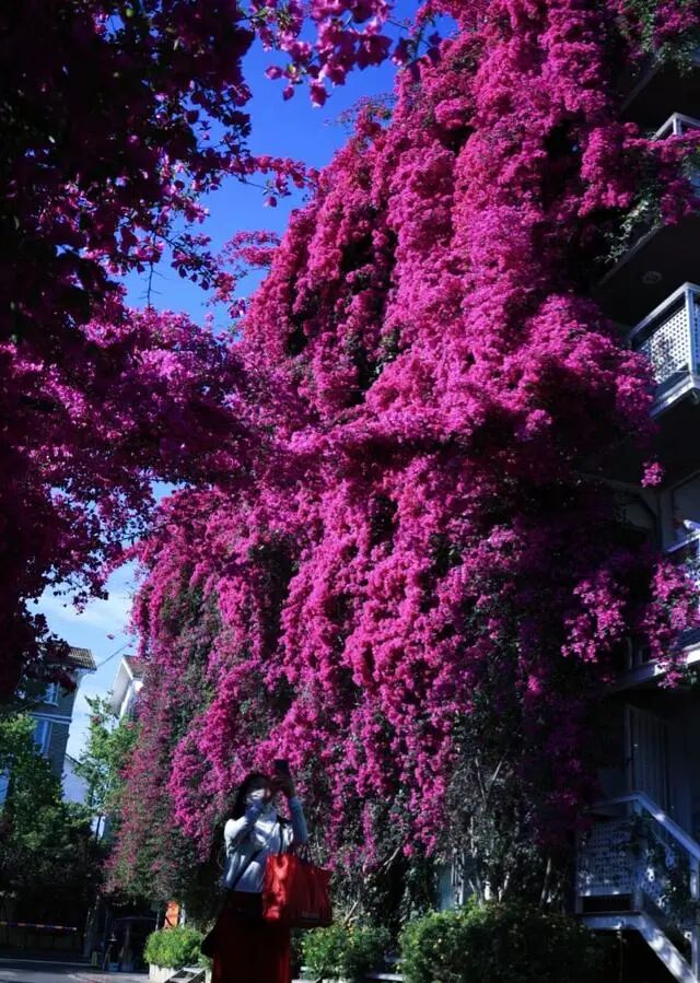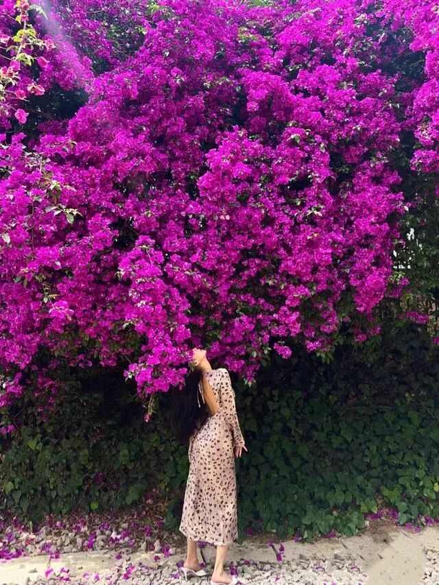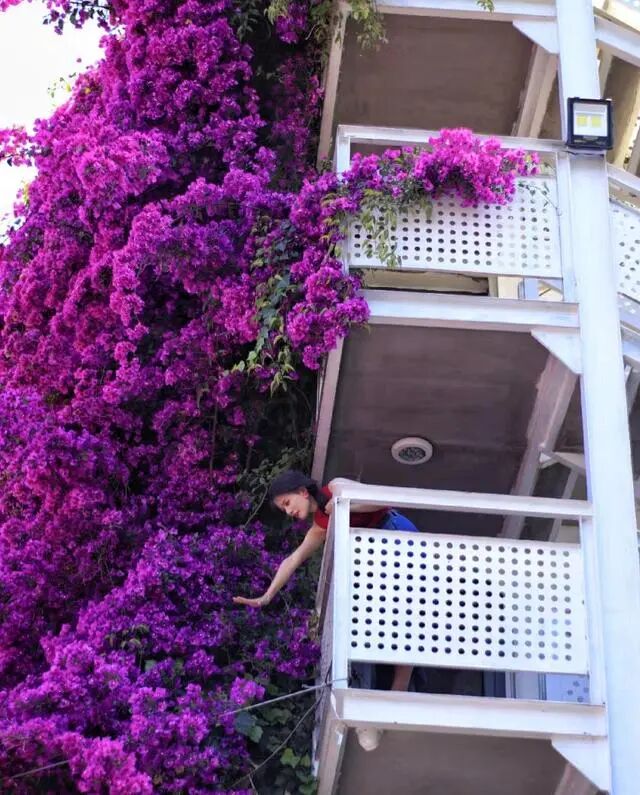 这棵三角梅除了开出一帘高空瀑布,它还沿着一层的围墙开出了一个“花拱桥”,站在一楼拍照就很出片,爬上楼层也很容易以花入背景,随便一件白衬衫白T恤都能拍出明媚又浪漫的美照。