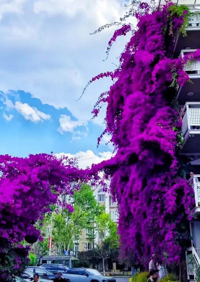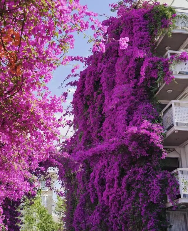 如果你家有院子,大可以地栽一棵云南紫三角梅,打造出“花落新林岸,云开瀑布泉”的诗意花境,楼顶或者露台栽种,让花枝往外生长也可以长成不错的小型花瀑布。