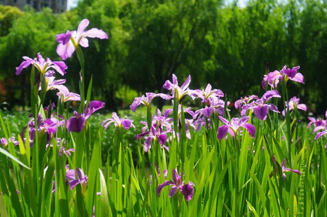 公园种植的花菖蒲品种也涵盖了多个品系,不同品系的花菖蒲各具特色、亮点纷呈,如有花型豪华绚烂的肥厚系品种‘蓝草纸’、花型为水平展开的江户系品种‘小紫’以及花型大小介于野生种与江户系的长井系品种‘长井初红’等。