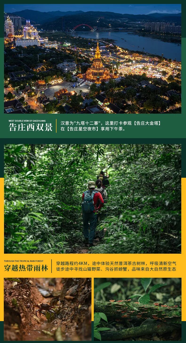 第三天:早上司土老寨徒步(3-5公里左右),中午体验丛林大餐,下午可挑战树降,乘车前往勐腊,入住酒店休息。