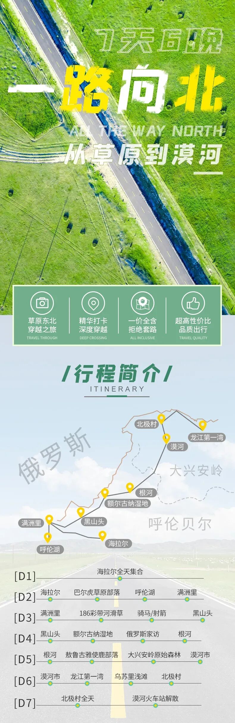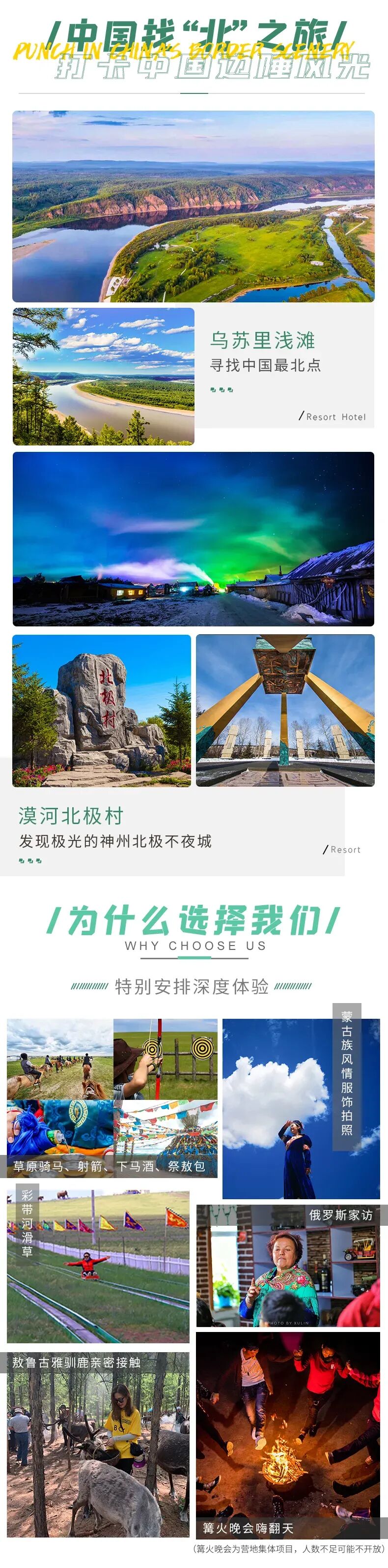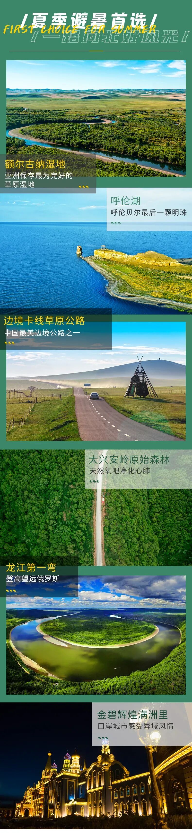 4.门票:呼伦湖门票、186彩带河门票、额尔古纳湿地景区+环保车、敖鲁古雅驯鹿园门票、龙江第一弯门票、北极村门票
