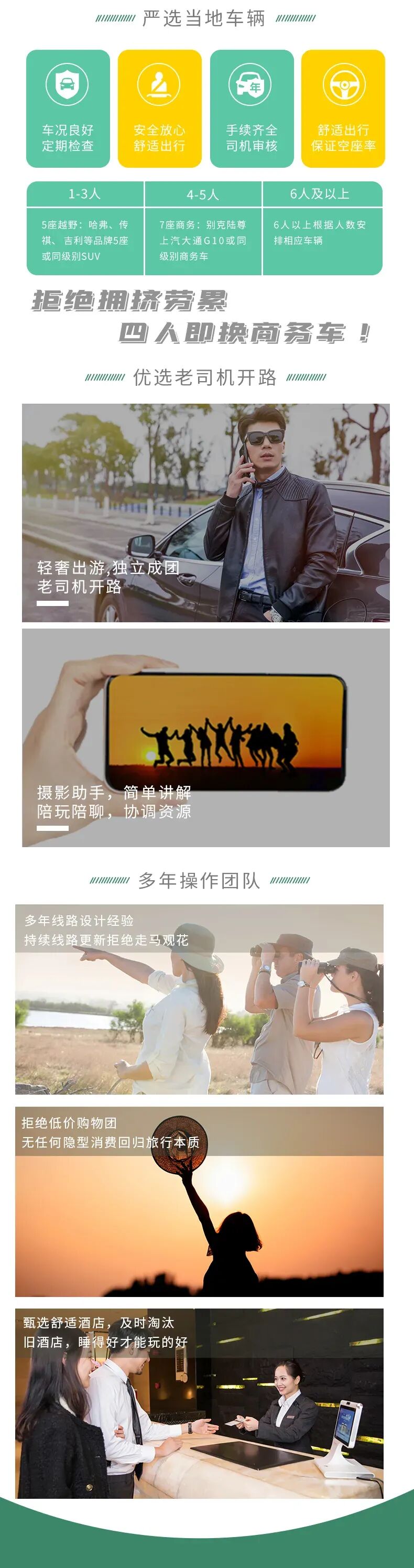 5、服务---多年操作团队,质量上乘、品牌保证;安排的车辆都是有资质手续,全程赠送保险,无忧出行。