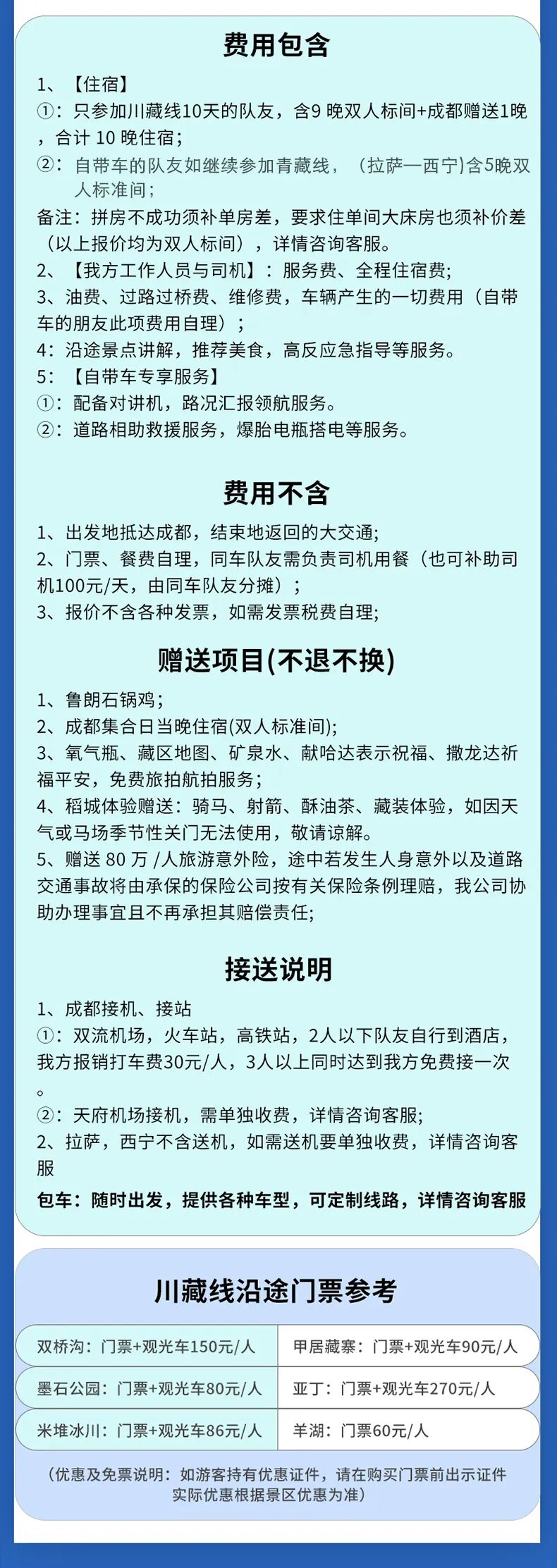行程:成都进拉萨出10日D00:成都集合D01:成都--雅安--泸定--海螺沟或牛背山 280kmD02:海螺沟(牛背山)半日游--康定--折多山--新都桥 170kmD03:新都桥--理塘--稻城县--亚丁香格里拉镇 450kmD04:亚丁景区一日游 0kmD05:亚丁--稻城--理塘--芒康 490kmD06:芒康--左贡--72拐--八宿 357kmD07:八宿--然乌湖---米堆冰川--波密 217kmD08:波密--通麦天险--鲁朗小镇--林芝 235kmD09:林芝--工布江达---拉萨 400kmD10:拉萨--羊卓雍措--拉萨 200KM