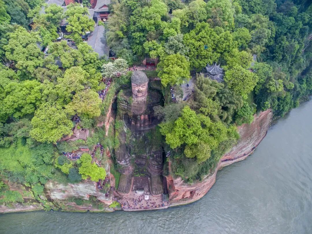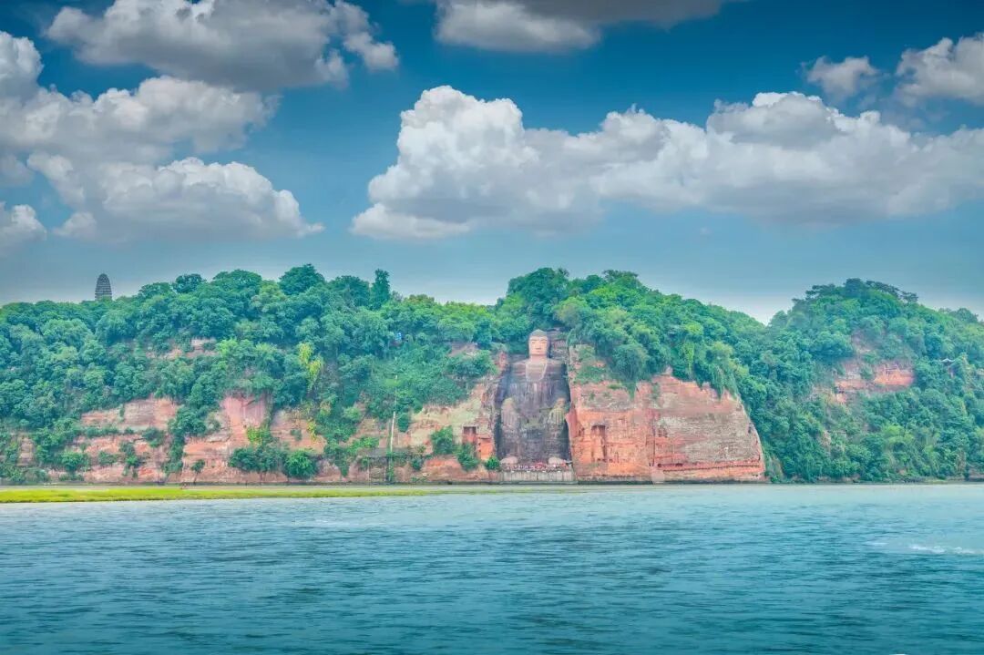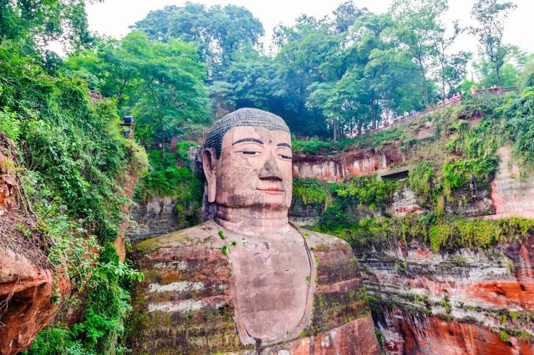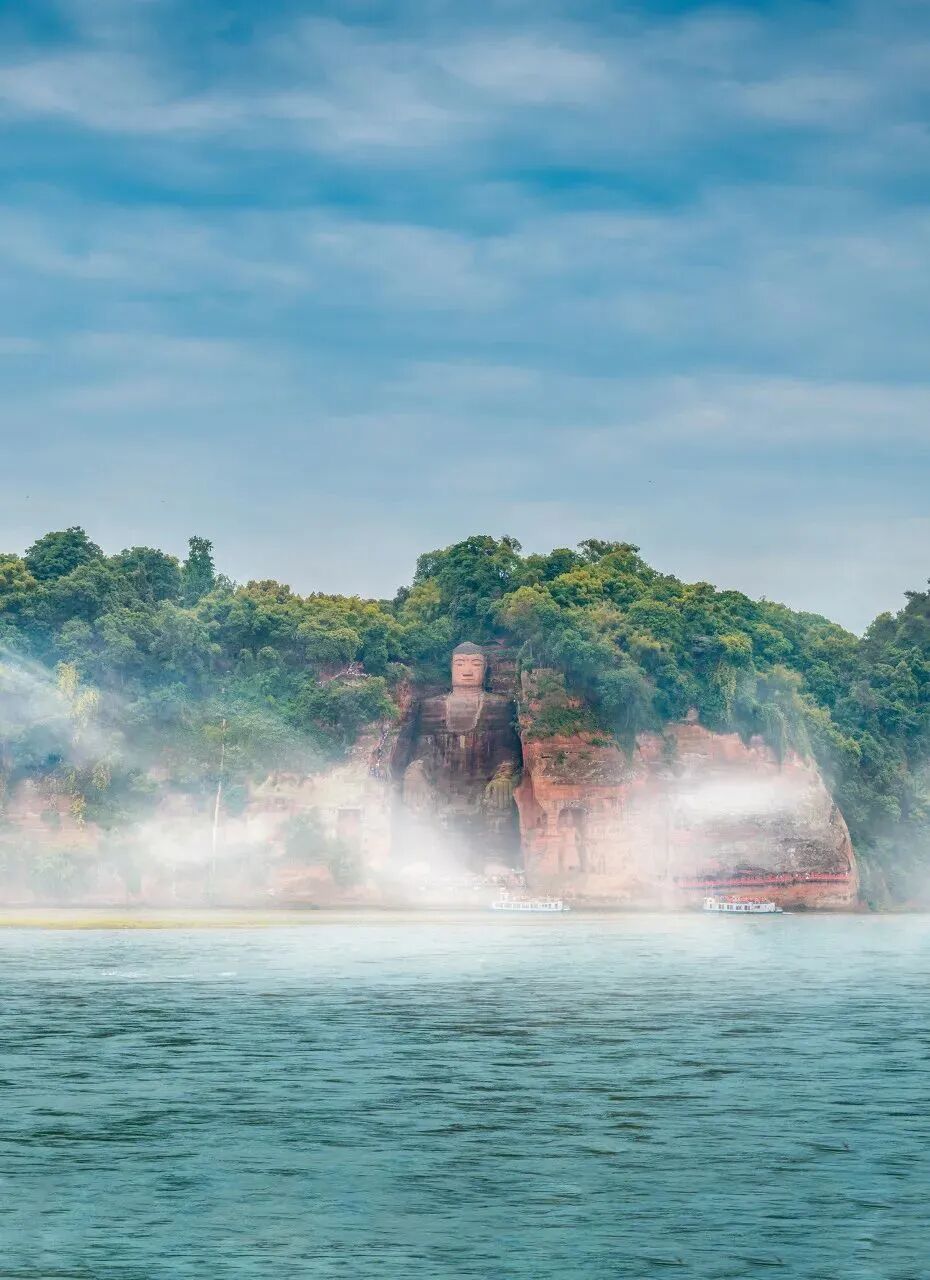 始凿于唐开元元年,历时90余年,有"山是一尊佛,佛是一座山"之称。乐山大佛头与山齐,足踏大江,双手抚膝,大佛体态匀称,神情肃穆,依山凿成,临江危坐。