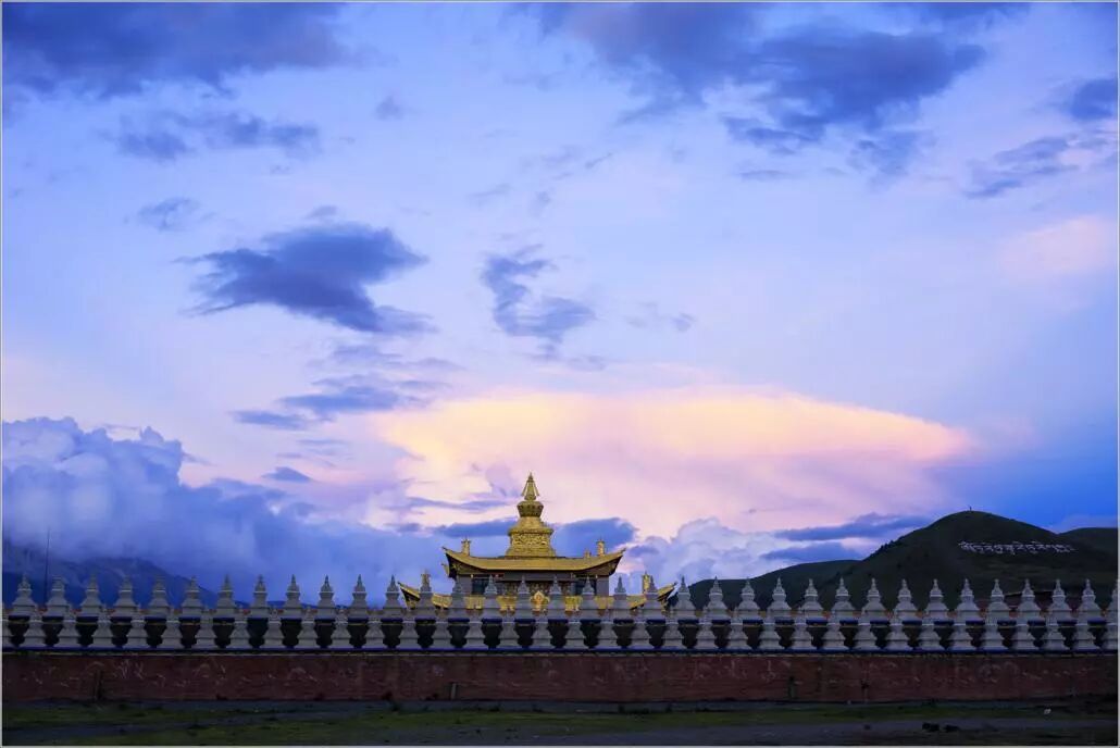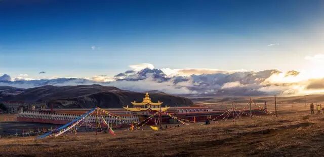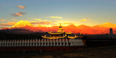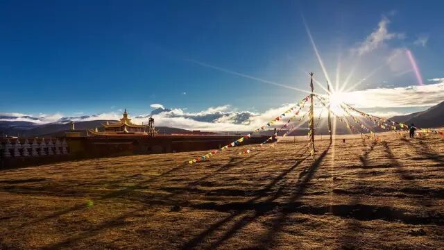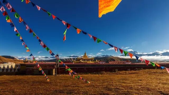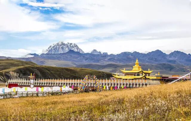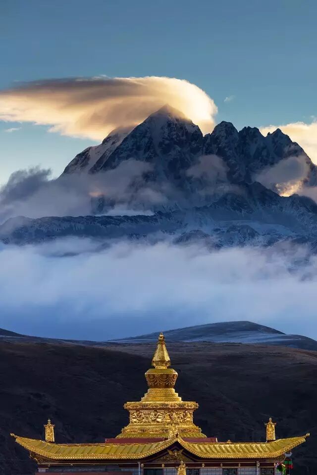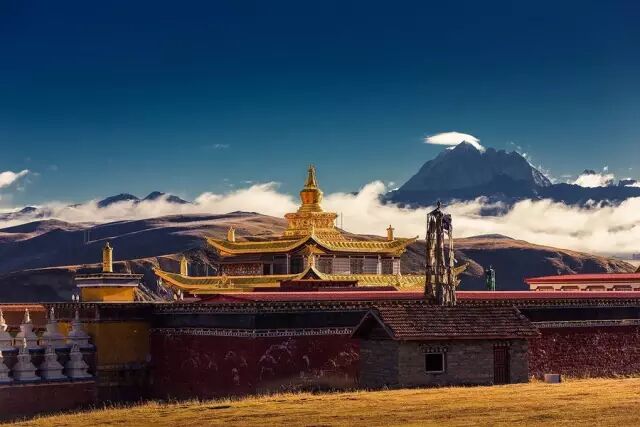 辽阔的天空下,雅拉雪山与金顶寺庙交相辉映,自然与人文色彩的配搭是如此的和谐壮丽。