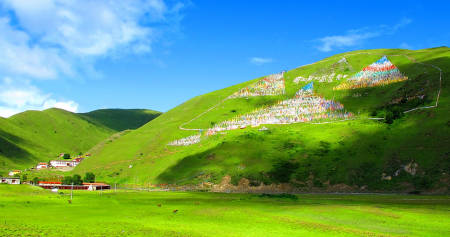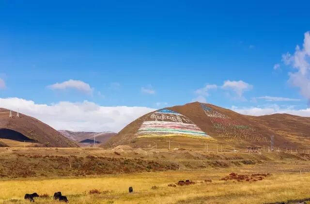 在塔公寺后,依次排列着三座青草覆盖的山丘,山丘上,由经幡组成的三角形旗阵在风中招展,十分壮观。