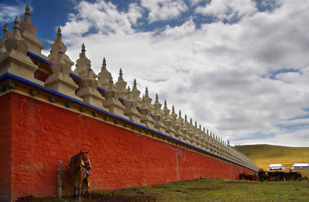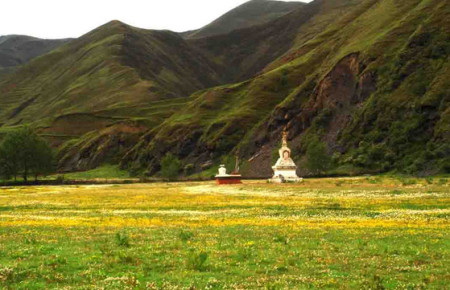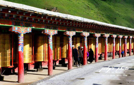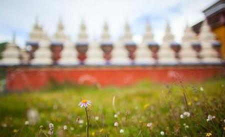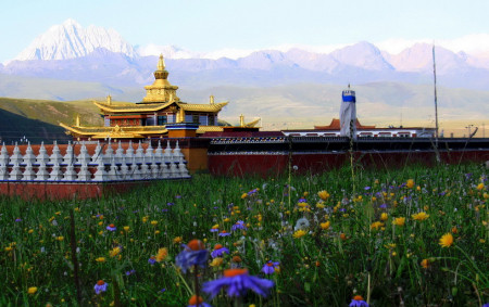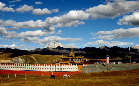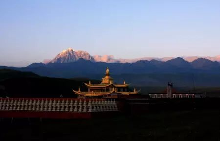 时而可以听到远处传来的悠扬婉转的牧歌声,在塔公寺后的右前方挺立着一座雄伟的雅拉雪山。